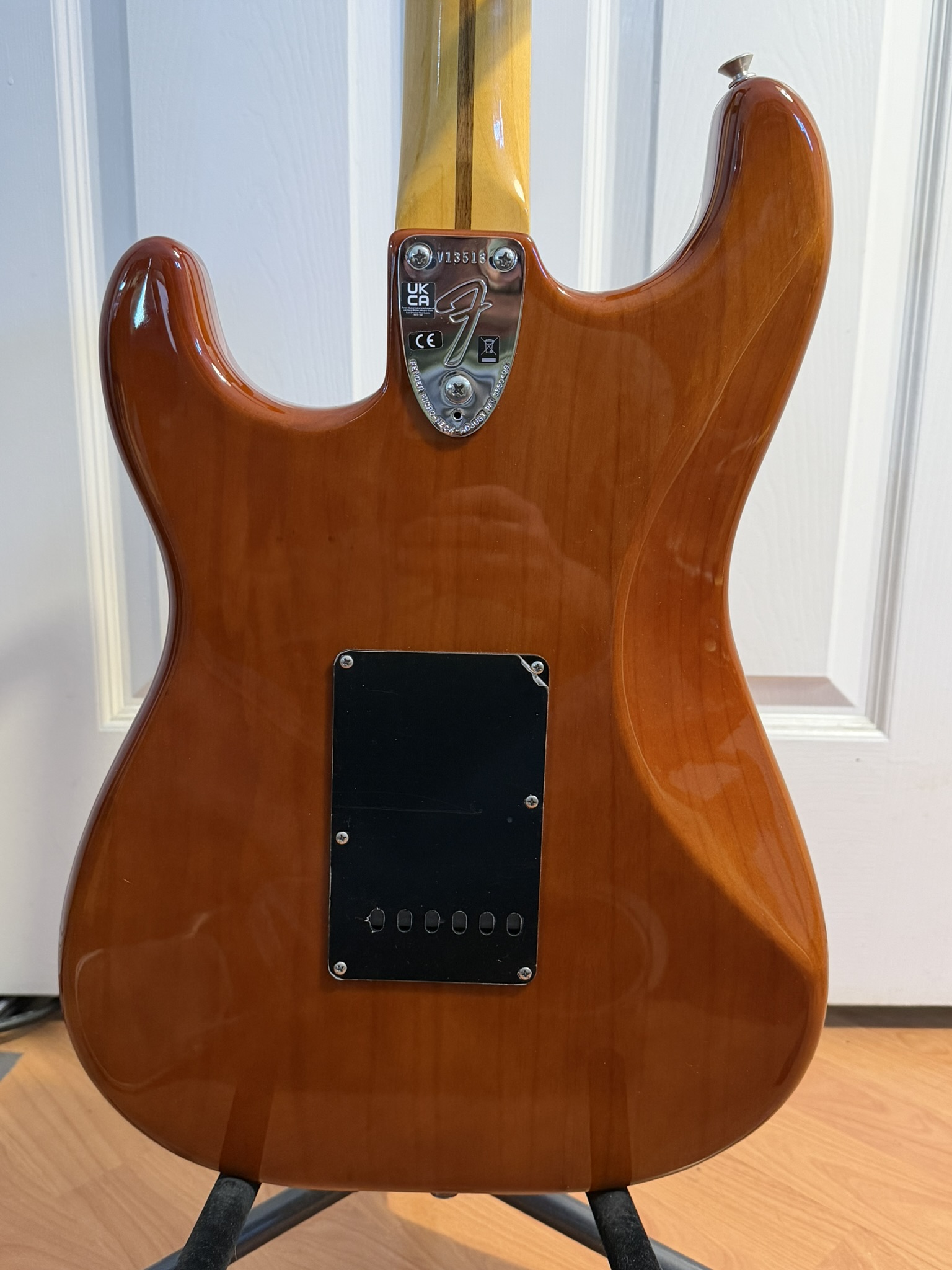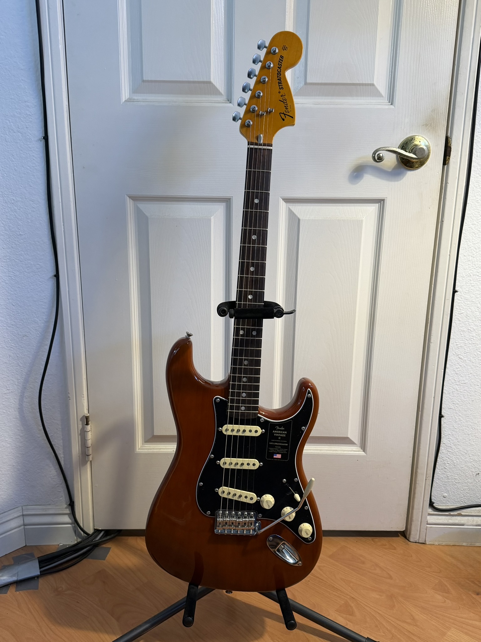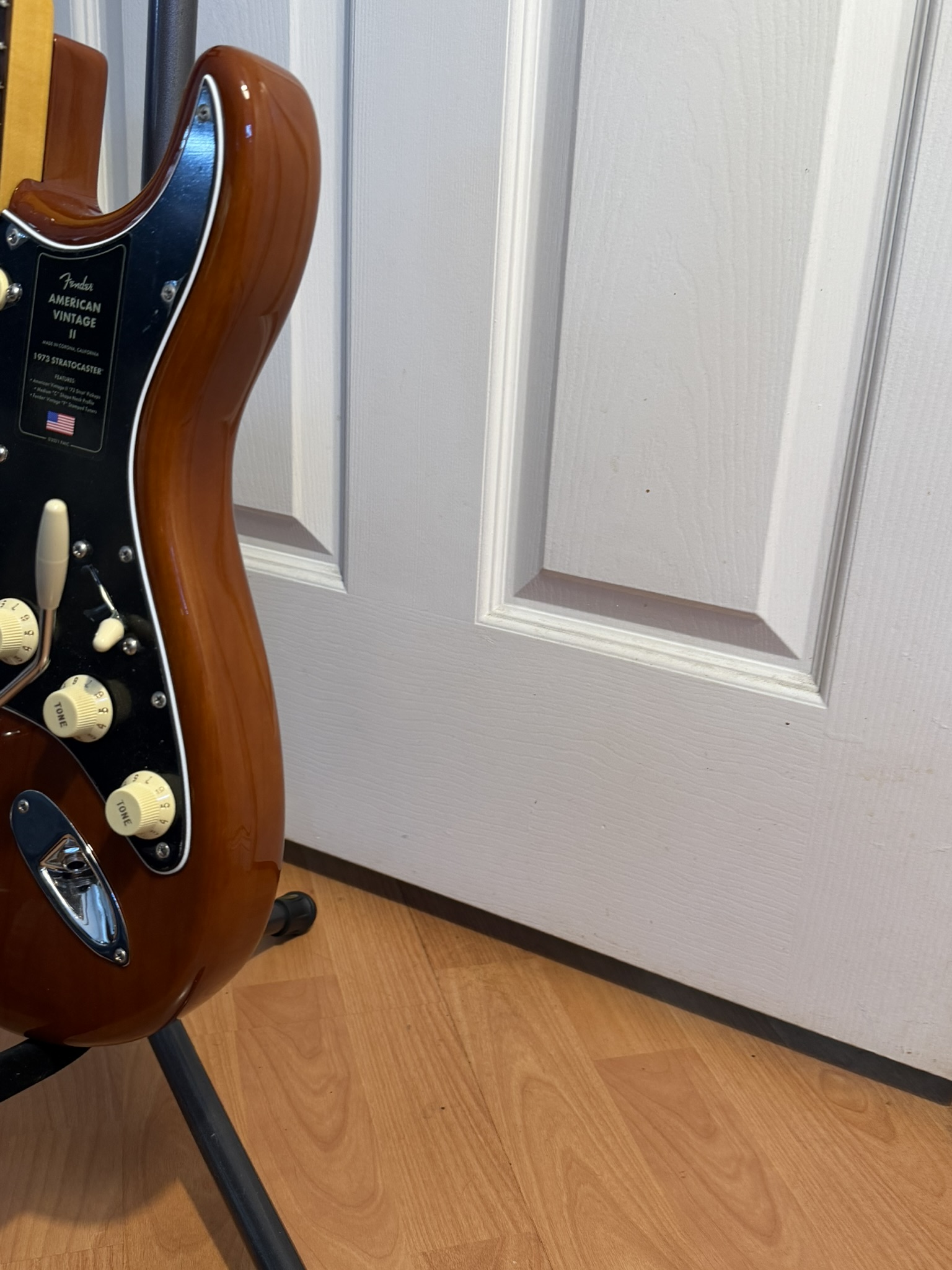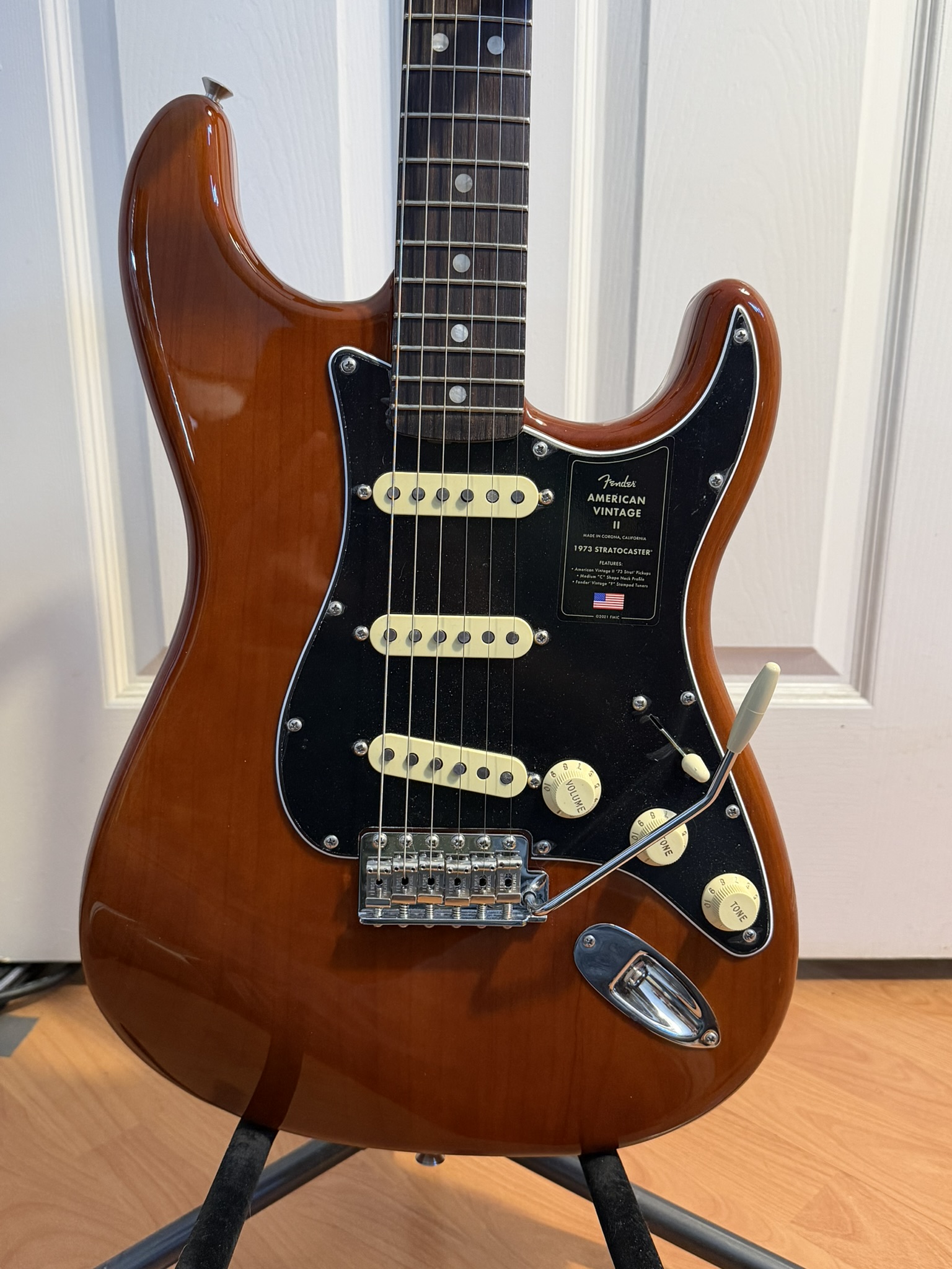 The American Vintage II 1973 Stratocaster® exudes the spirit of the era and is outfitted with a trio of Pure Vintage '73 staggered pole pickups, a large headstock with dual string trees, a convenient "Bullet" style truss rod nut and a three-bolt neck plate with Micro-Tilt™ mechanism. The "C"-shape maple neck plays like a dream with a 7.25" radius rosewood or maple fingerboard and vintage tall frets. The guitar is offered in three classic colors over ash: Aged Natural, Lake Placid Blue and Mocha, the latter being the first custom color ever to feature a black pickguard on a Strat®. Additional features include vintage-style "F" stamped tuners and a synchronized tremolo with bent steel saddles and cold rolled steel block.